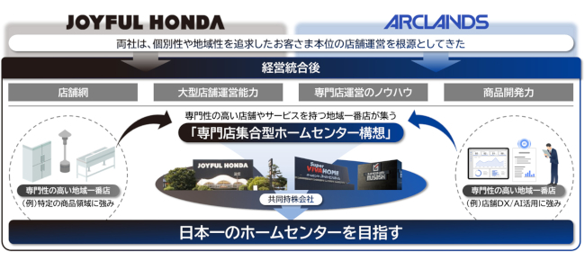 今回発表された両社の経営統合は、両社の顧客である生活者の住まいや暮らしに対する価値観の多様化や異業種からの参入、EC市場の拡大といった要因で小売業界の環境が大きく変化する中にあって、より便利で快適な購買体験の実現、および企業と店舗の持続的な発展を目指して行われる。経営統合を通じて、店舗網の拡大とともに両社がこれまで培ってきた大型店舗運営能力、専門店運営のノウハウ、商品開発力といった強みを融合させることで、専門性の高い売場やサービスの充実を図る。