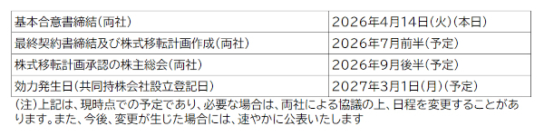 経営統合は、以下のスケジュールで進められる予定となっている。