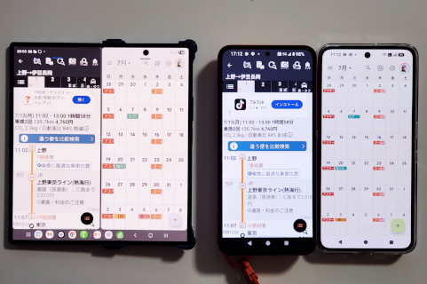 Foldの強みが最も分かりやすく表れるのが、地図アプリやナビ、タクシーアプリなどだ。表示領域が広いため、全体を俯瞰する使い方と、細部を拡大して確認する使い方を瞬時に切り替えられる。これはPC時代から“大きな画面の価値”を体感してきた世代にとって、極めて自然な感覚だろう。