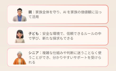 もう一つの柱が、家族のコンテキスト(状況)を理解した調整機能。家族全員のスケジュール、体調、移動状況などを踏まえ、AIが最適な提案を行う。記者会見では「祖母の誕生日に全員が集まる」という例が紹介され、誰にどの情報を伝えるべきかをAIが判断する様子が示された。
