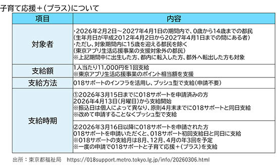 もっとも、今回の子育て応援+は、2026年3月15日までに018サポートを申請済みであれば、改めて申請しなくとも原則4月末までに018サポートと同日に支給される。3月16日以降に018サポートを申請した場合も、018サポートの初回支給日と同日に支給される。ここから見えるのは、東京都が新制度を一から立ち上げるのではなく、既存の018サポート基盤を使って迅速に支給しようとしている姿勢である。
