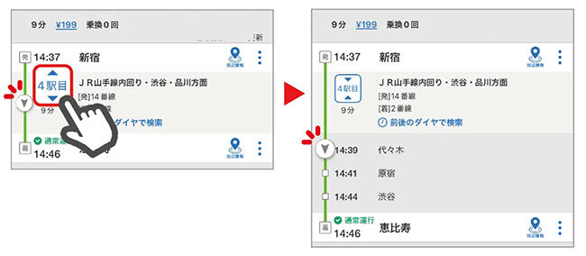 そのまま「探す」ボタンをタップするだけで、再検索画面へ遷移し、その際に検索条件には「リアルタイム情報」から導き出された「次に到着する停車駅」と「現在時刻」が自動的にセットされるので、代わりのルートを素早く見つけ出せる。また、特定の路線を経路から回避して検索することもできるため、状況に応じた経路の選択が可能になる。