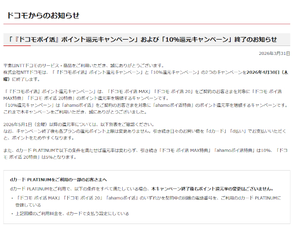 「『ドコモポイ活』ポイント還元キャンペーン」は、2025年6月5日に提供開始した「ドコモ ポイ活 MAX」/「ドコモ ポイ活 20」契約者を対象としたポイント還元率上乗せキャンペーン。一方、「10%還元キャンペーン」は、オンライン専用ブランド「ahamo」の「大盛りオプション」契約者のみ加入できる「ポイ活オプション」契約者を対象としています。ともに5月1日以降は、対象の決済サービスの利用に対し、「ドコモ ポイ活特典/ahamo ポイ活特典」の通常の還元率を適用します。「ドコモ ポイ活 MAX」を例にすると、4月30日までのキャンペーン期間中は、指定の条件を満たすと、dカードの種別を問わず、通常のポイント還元率+10%だったところ、5月1日以降は、カード種別ごとに+10%/+5%/+3%となり、プラチナカードの「dカード PLATINUM」以外は還元率がダウンします。