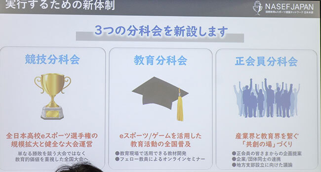冒頭でNASEF JAPANの柿原正郎理事長が活動基本方針を発表した。NASEF JAPANはeスポーツ/ゲームを通じて、自ら考える力を養ったり、仲間とのチームワークを育んだり、デジタルを活用する力を身に付けたり、多様性を認め合う力をつけるなど「学びの入口をつくる」という理念を掲げる。遊びで終わらせるのではなく、「eスポーツ×教育」の考えがベースにある。