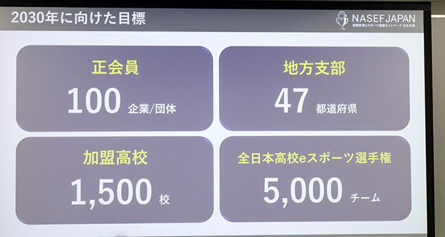 NASEF JAPAN(国際教育eスポーツ連盟ネットワーク 日本支部)は4月24日、活動基本方針と2026年度の活動計画、正会員28企業/団体が参画したプレス発表会を開催した。30年までの目標として、正会員100企業/団体、47都道府県に地方支部を新設、加盟高校1500校、全日本高校eスポーツ選手権の参加5000チームを掲げた。
