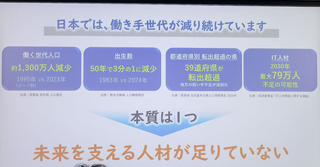 また、未来を支える人材を育成する目的もある。1995年と2023年を比べると、働く世代人口は約1300万人減少している。1983年と2024年を比較すると、出生数は50年で3分の1に減少。都道府県別の転出超過の県は、39道府県に及ぶ。さらに、2030年にIT人材は最大79万人不足するといわれている。