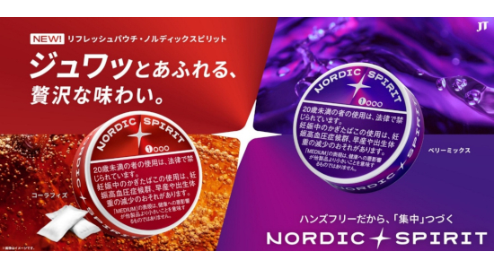 JTは、リフレッシュパウチ「ノルディックスピリット」から、「ベリーミックス・ミディアム」を、全国のセブン-イレブン・ローソン・NewDaysおよび一部たばこ販売店で5月25日から順次販売を開始する。あわせて、「コーラフィズ・ミディアム」についても、同日から全国の一部たばこ販売店での取り扱いを開始する。
