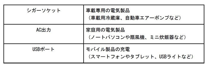 出力ポートの種類から、ポータブル電源を選ぶのもおすすめ。ポータブル電源の出力ポートは「シガーソケット」「AC出力」「USBポート」の3種類があります。出力ポートによって使用例が異なるため、以下を参考にしてください。