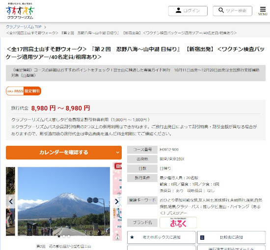 ツアー料金は8980円。行き先は忍野八海→山中湖花の都公園→諏訪神社→山中湖→河口湖の5カ所で、晴れていれば富士山を間近に見ながら各地を観光できます。「富士山すそ野ウォーク」の一つで、散策が多い観光で合計8kmを歩くことになりますが、最後の河口湖付近では温泉に入浴して、18時30分に出発地の新宿に到着するコースです。