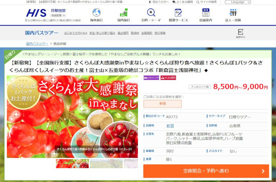 ツアー料金は8500円から9000円。行き先は忍野八海→新倉富士浅間神社→山梨FUJIフルーツパーク→シャトー勝沼→さくらんぼ狩り→ハーブ庭園旅日記勝沼庭園で、晴れていれば富士山の絶景を満喫しながら観光できます。山梨の特産物の一つであるフルーツ「さくらんぼ」狩りで食べ放題ができ、シャトー勝沼ではワインの試飲も可能です。