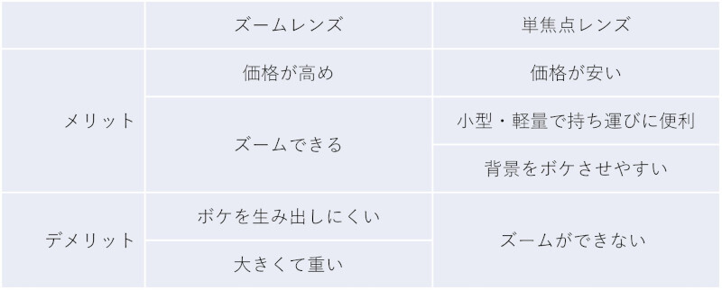 一眼カメラで選べるレンズは、「ズームレンズ」と「単焦点レンズ」の2つに分けられます。
