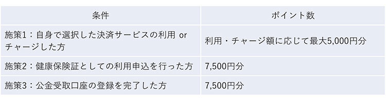 マイナポイントをもらうためには、2023年2月末までにマイナンバーカードの申請が必要です。申請した方には、最大2万円分のポイントが付与されます。施策ごとの付与条件と付与されるポイント数は、以下のとおりです。
