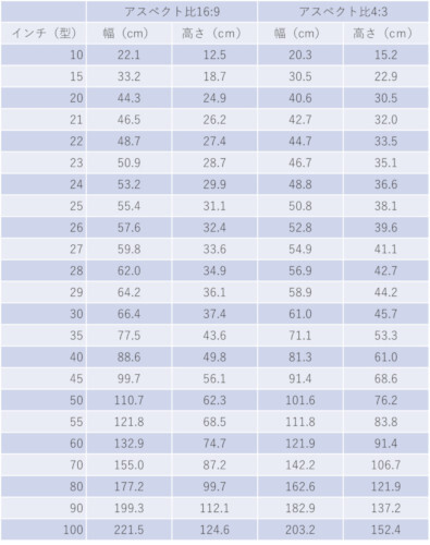 インチについて理解できたところで、実際のインチ(型)における幅と高さを見ていきましょう。以下では、インチ(型)ごとの幅と高さを表にしています。購入の際の参考にしてください。