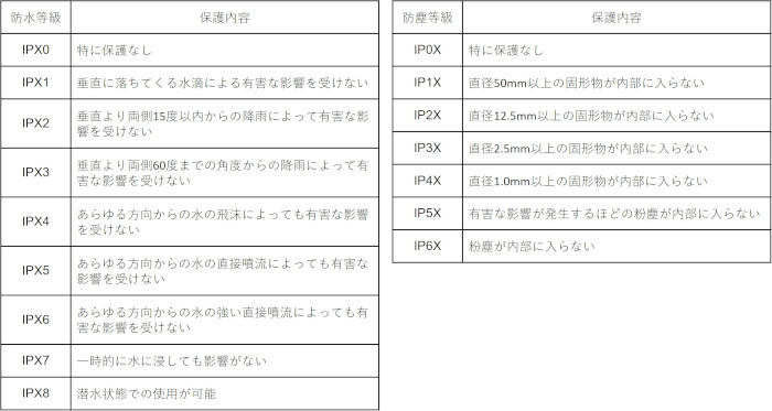 防水・防塵性能の等級と保護内容は以下の表のようになっています。