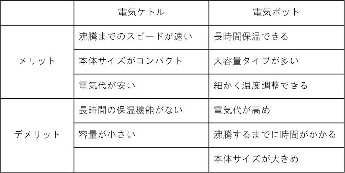 では、電気ポットと電気ポットそれぞれのメリット・デメリットについても見ていきましょう。電気ケトルと電気ポットのメリット・デメリットは、以下の表のとおりです。