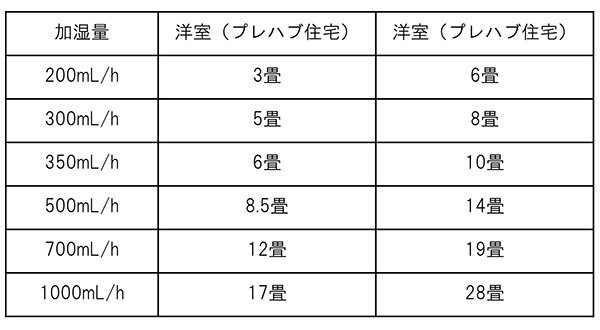 以下は、部屋のサイズ別の加湿量目安です。加湿器選びの参考にしてください。