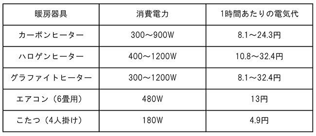 また、こたつやエアコンなど他の暖房機器との消費電力の違いについても比較するので、購入の際の目安としてお使いください。