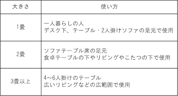 ひと口にホットカーペットといっても、0.5畳程度の製品から大きいものであれば4.5畳程度の製品まで大きさもさまざまです。大きさと使用イメージは、以下のようになります。
