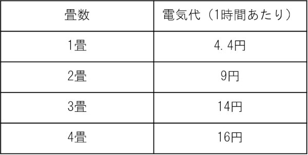 上述しましたが、ホットカーペットでは面積が大きいほど消費電力が増え、電気代が高くなります。1時間あたりの消費電力量の目安は、以下のとおりです。