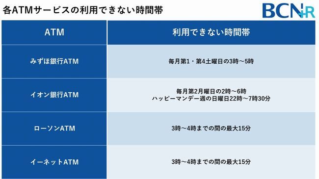 なお、各ATMには以下のように取り引きできない時間帯もありますので、ご注意ください。