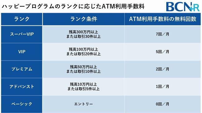 ATM手数料が0円(最大月7回まで、要ハッピープログラムエントリー)