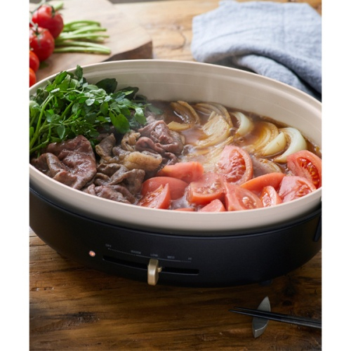 付属のハンドルを使ってプレートを簡単に取り外せるため、調理中の入れ替えもスムーズ。深鍋を使えば、シチューや鍋料理もそのまま食卓で仕上げられます。さらに、くず受けトレイ付きで後片付けもラクラク。見た目以上に実用的な設計です。「おしゃれなデザイン家電が欲しい」「テーブルの上で料理を囲みながら楽しみたい」という方には特におすすめです。