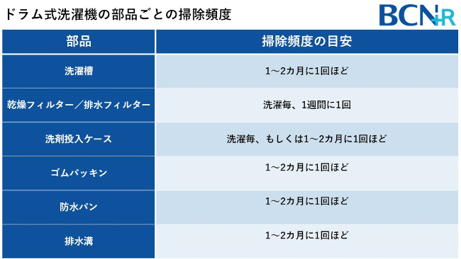 また、洗濯槽やゴムパッキン、防水パンなどの大型部品は1カ月~2カ月に1回の掃除を心がけましょう。