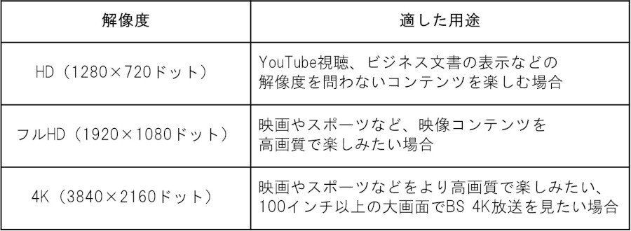 画質に影響する解像度や明るさ(輝度)についても理解しておきましょう。解像度とは、どれだけ細部まで画像をキレイに映せるかを表したものです。映像を楽しむのであれば、HD以上をおすすめします。よりこだわるのであれば、4Kも検討しましょう。