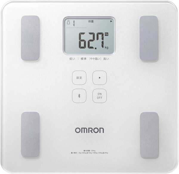 測定項目:体重、体脂肪率、BMI、水分量、基礎代謝量、内臓脂肪、体脂肪量、除脂肪体重、骨量、筋肉量、心拍数、タンパク質、体内年齢、骨格筋量、皮下脂肪率、ボディタイプ