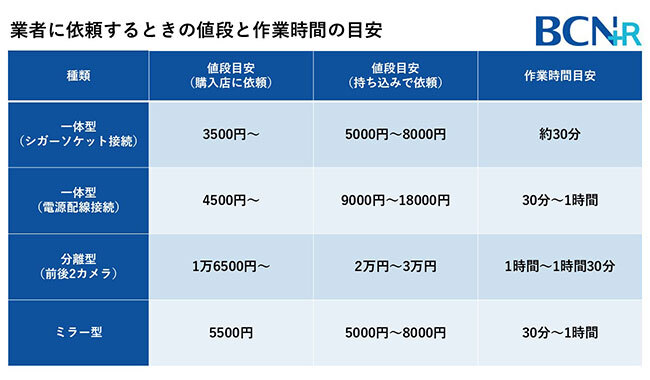 また、万が一の不具合があった際も、施工店舗でサポートを受けられる点は大きな安心材料です。なお、ドライブレコーダーの取り付け費用は、レコーダーを購入した店舗に依頼するか、業者へ持ち込みで依頼するかで以下のように異なります。