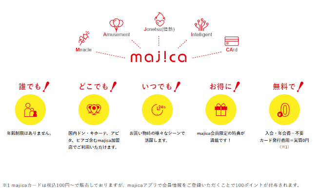 majica(マジカ)とは、ドン・キホーテグループが提供している電子マネーサービスです。現金をチャージして支払うプリペイド型の電子マネーで、買い物時に使うとポイントが貯まる仕組みになっています。