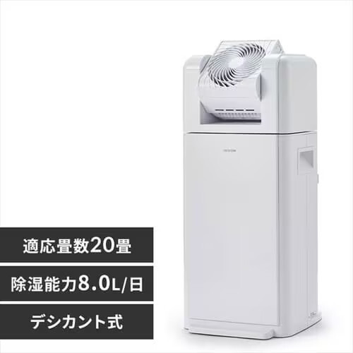 アイリスオーヤマのIJDC-K80はデシカント方式のの除湿機とサーキュレーターが一つになった特殊な衣類乾燥除湿器です。適用畳数は20畳で除湿性能は8L/日。