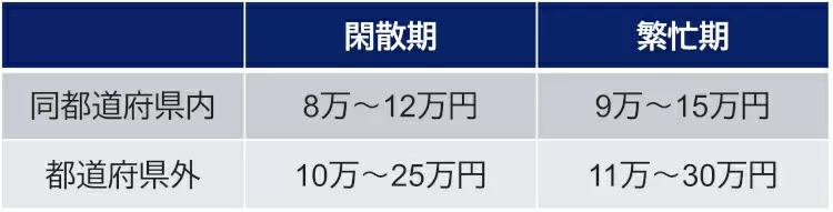 次に、家族(4人家族)での引っ越し相場を見ていきましょう。こちらも距離と時期によって大きく変動します。