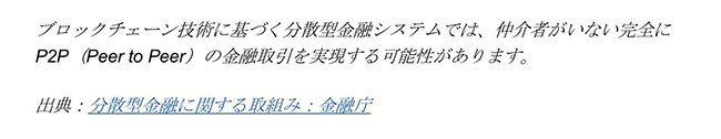 金融庁でも、ブロックチェーンのような技術を用いることで、仲介者なしの「P2P」での取引が実現できると示唆されています。