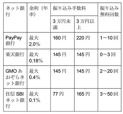 法人口座を開設したいと考えているなら、GMOあおぞらネット銀行を検討しましょう。PayPay銀行と違って金利面の魅力は少ないですが、振り込み手数料がPayPay銀行よりも安いほか、口座開設の翌々月まで振込手数料が無料になる特典があります。