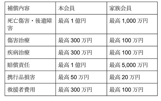 加えて、自動付帯なので旅行代金をほかのクレジットカードで支払っていても、補償を受けられるのが便利です。補償内容を以下の表にまとめました。
