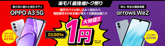 2025年8月現在、楽天モバイルではOPPO A3 5Gやarrows We2といったAndroid端末を一括1円で購入できるキャンペーンを実施しています。