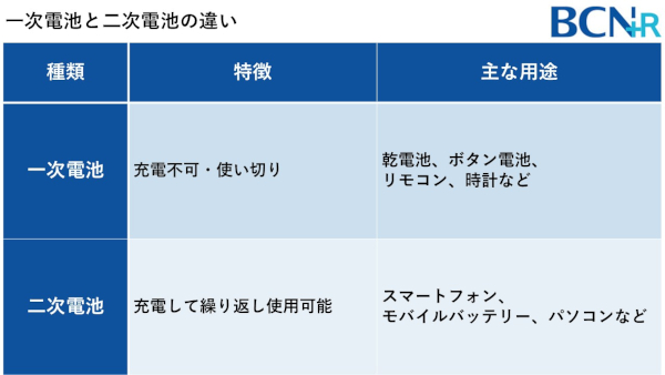 バッテリーについて理解するうえで、押さえておきたいのが「一次電池」と「二次電池」の違いです。