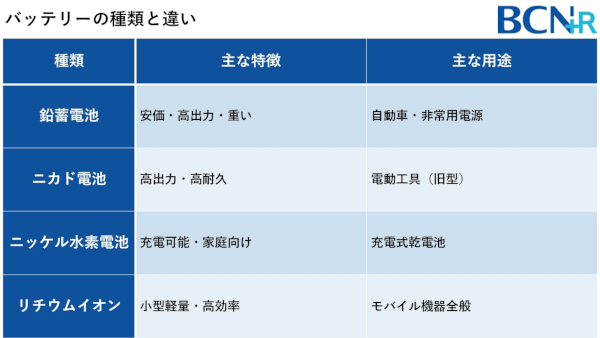 このように、「使い切りか、繰り返し使えるか」という視点で電池を整理しておくと、リチウムイオンバッテリーの位置づけがわかりやすくなります。