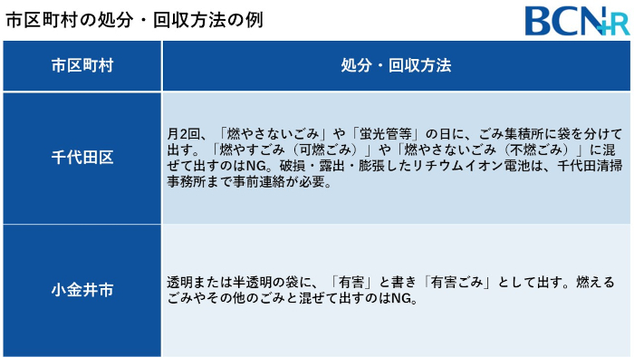 リチウムイオンバッテリーの扱いは自治体ごとに異なり、「回収を行っている自治体」もあれば、「具体的な廃棄方法のみ案内している自治体」もあります。たとえば、東京都の千代田区や小金井市では、モバイルバッテリーを含む充電式電池を一般ごみとして回収対象としており、正しくごみとして出すことで安全に処分が可能です。