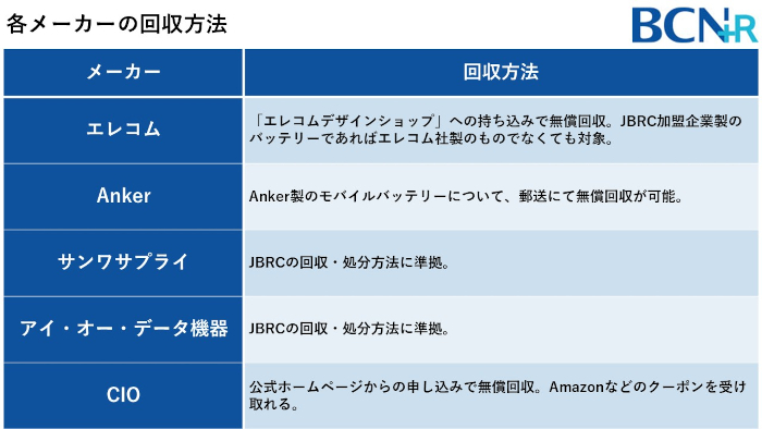 近年は安全対策や環境配慮の観点から、主要メーカーが自主的に回収・リサイクルを行っているケースが増えています。たとえば、エレコム、Anker、サンワサプライ、アイ・オー・データ機器、CIOなどは、公式サイト上でモバイルバッテリーの回収やリサイクル方針を案内しています。