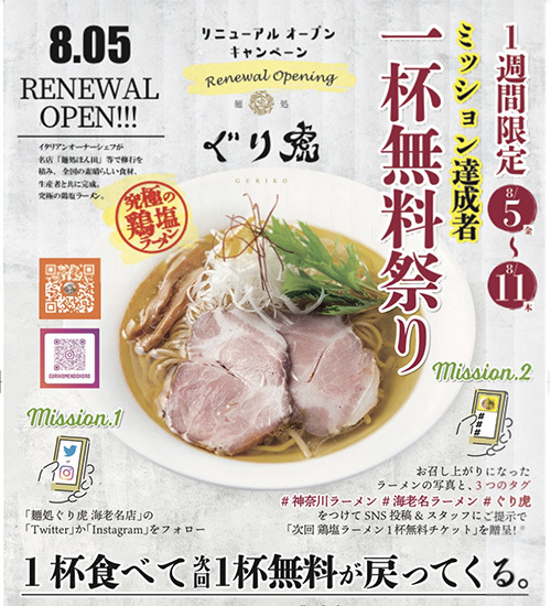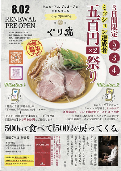 • 神奈川・海老名市でラーメン1杯500円! 「麺処ぐり虎 海老名店」の改装オープンで