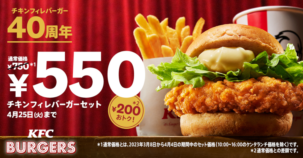 KFC、「チキンフィレバーガーセット」が「550円」のキャンペーン開始!