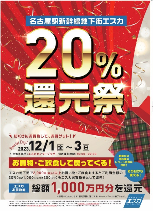 名古屋駅の地下街「エスカ」で「20%還元祭」!