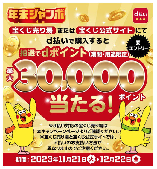 - 「宝くじ売り場または宝くじ公式サイトのいずれかで、合計6,000円以上d払いで購入すると、抽選でdポイントが最大30,000ポイント当たるキャンペーン」=https://service.smt.docomo.ne.jp/keitai_payment/campaign/dpay_takarakuji_231121_4903/