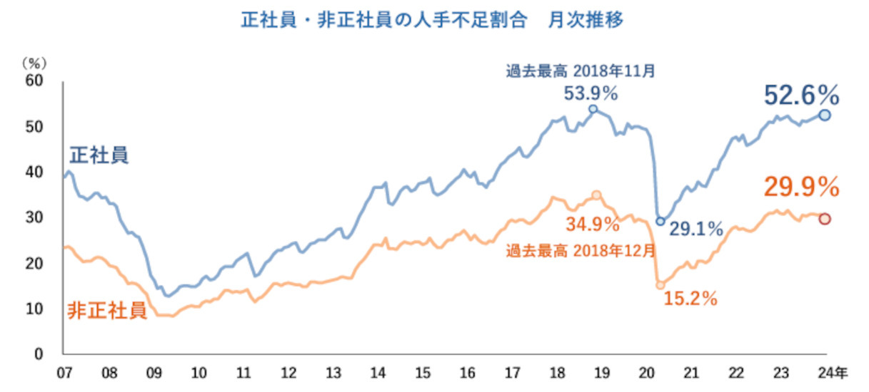 TDB調べ、正社員の人手不足は52.6%、「人手不足倒産」は過去最高