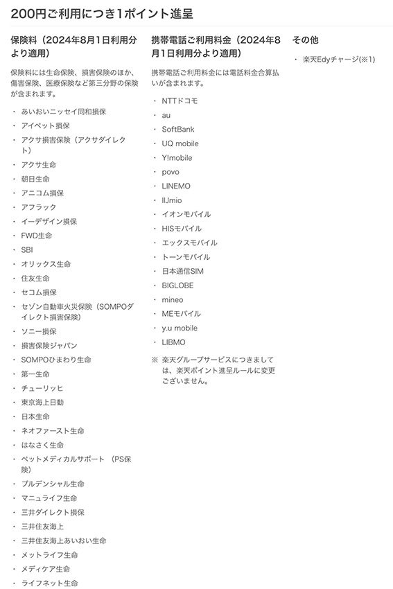 • 楽天カード、保険料・携帯料金など一部の利用先を対象に、2024年8月1日利用分からポイント進呈ルールを変更