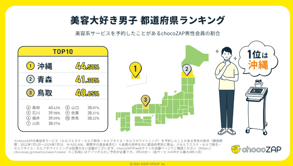 chocoZAP会員データから都道府県ランキング、美容男子1位は「沖縄」、コスパ意識1位は「島根」