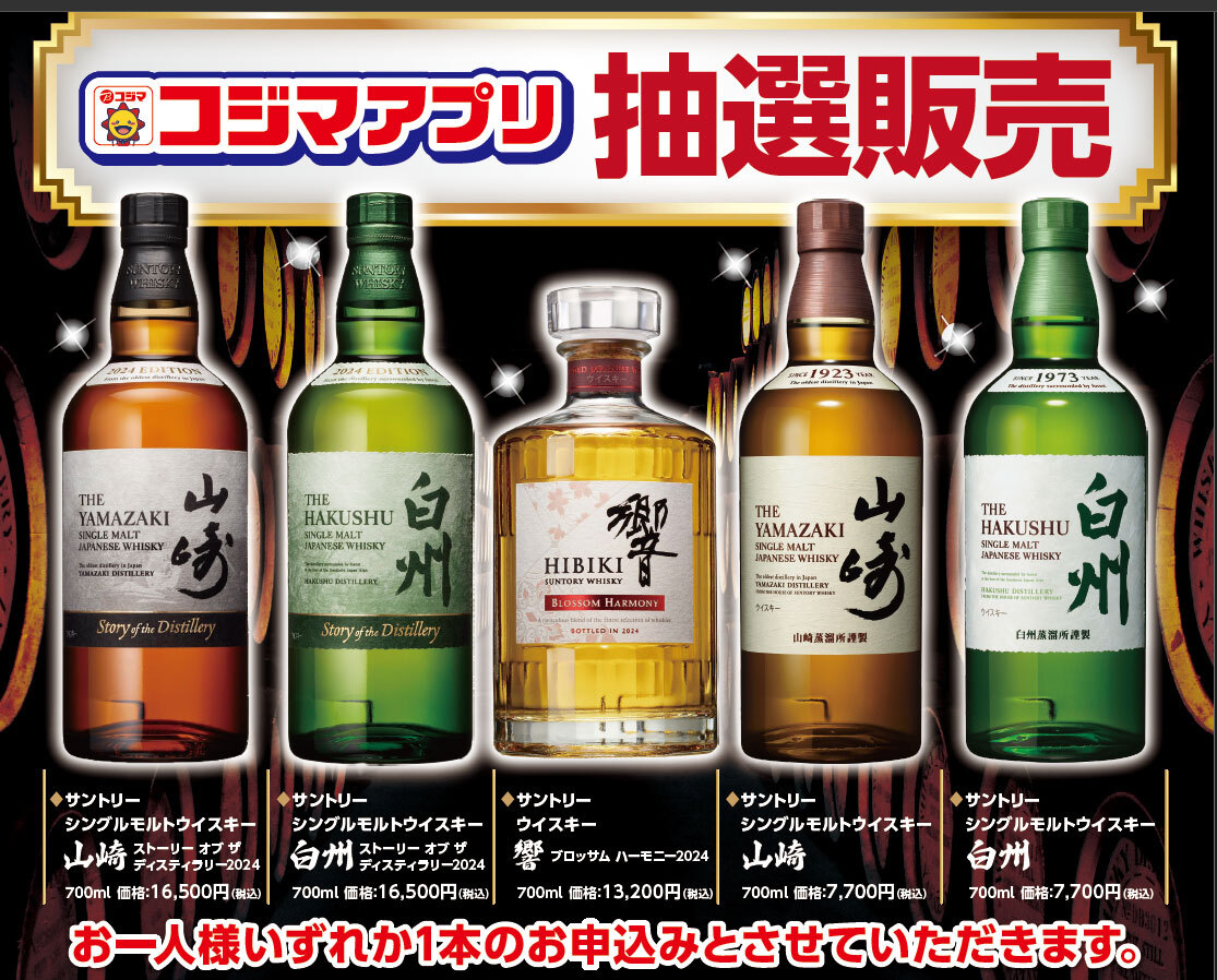コジマ、サントリーの希少なウイスキー「山崎」「響」「白州」の抽選販売を実施!