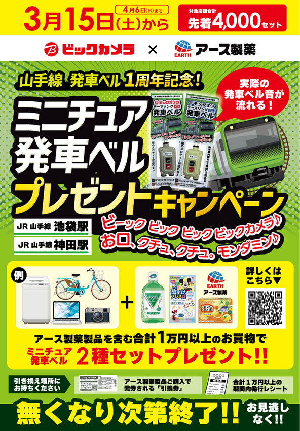 ビックカメラ、JR池袋駅・山手線の発車ベル1周年で、JR神田駅の「モンダミン」と合同キャンペーン 2025/03/07 18:00 Tweet 1/2 ビックカメラのテーマソングがJR池袋駅で採用されて1周年 記事詳細ページ 注目の記事 JR山手線「池袋駅」の発車メロディー、「ビーック ビックビック ビックカメラ♪」のテーマソングに! 3月1日からビックカメラのテーマソングが発車メロディに! JR山手線の池袋駅で ビックカメラでNo.1の売り場は「けん玉コーナー」!? 入社2年目の女性社員のつくったコーナーが大賞に 今年も花粉症の季節がやってきた、おすすめの「空気清浄機」おしえて! 新生活が始まるあの人に贈りたい、あると役立つ「キッチングッズ」おしえて! 外部リンク ビックカメラ=https://www.biccamera.co.jp/